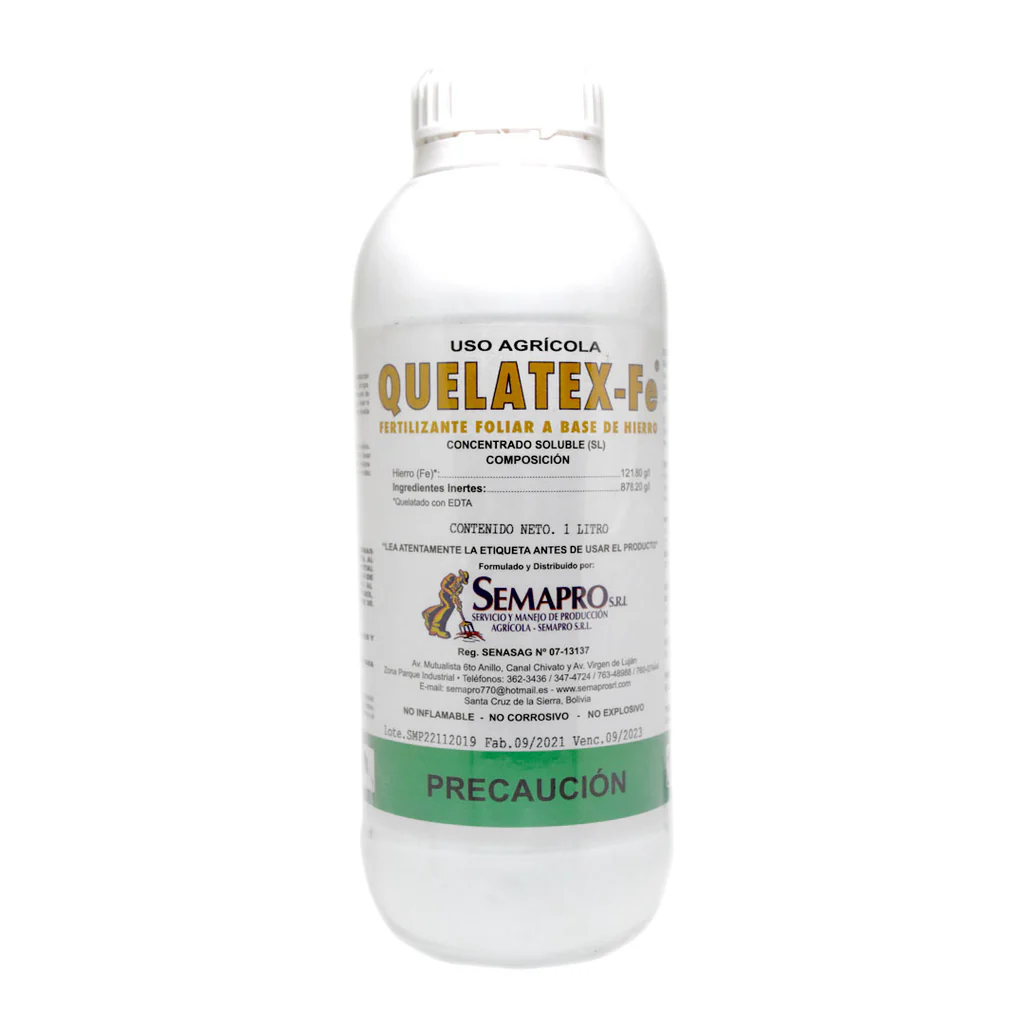 QUELATEX–Fe es un corrector de clorosis férrica presentando como solución liquida altamente concentrada, a base de hierro acomplejado.